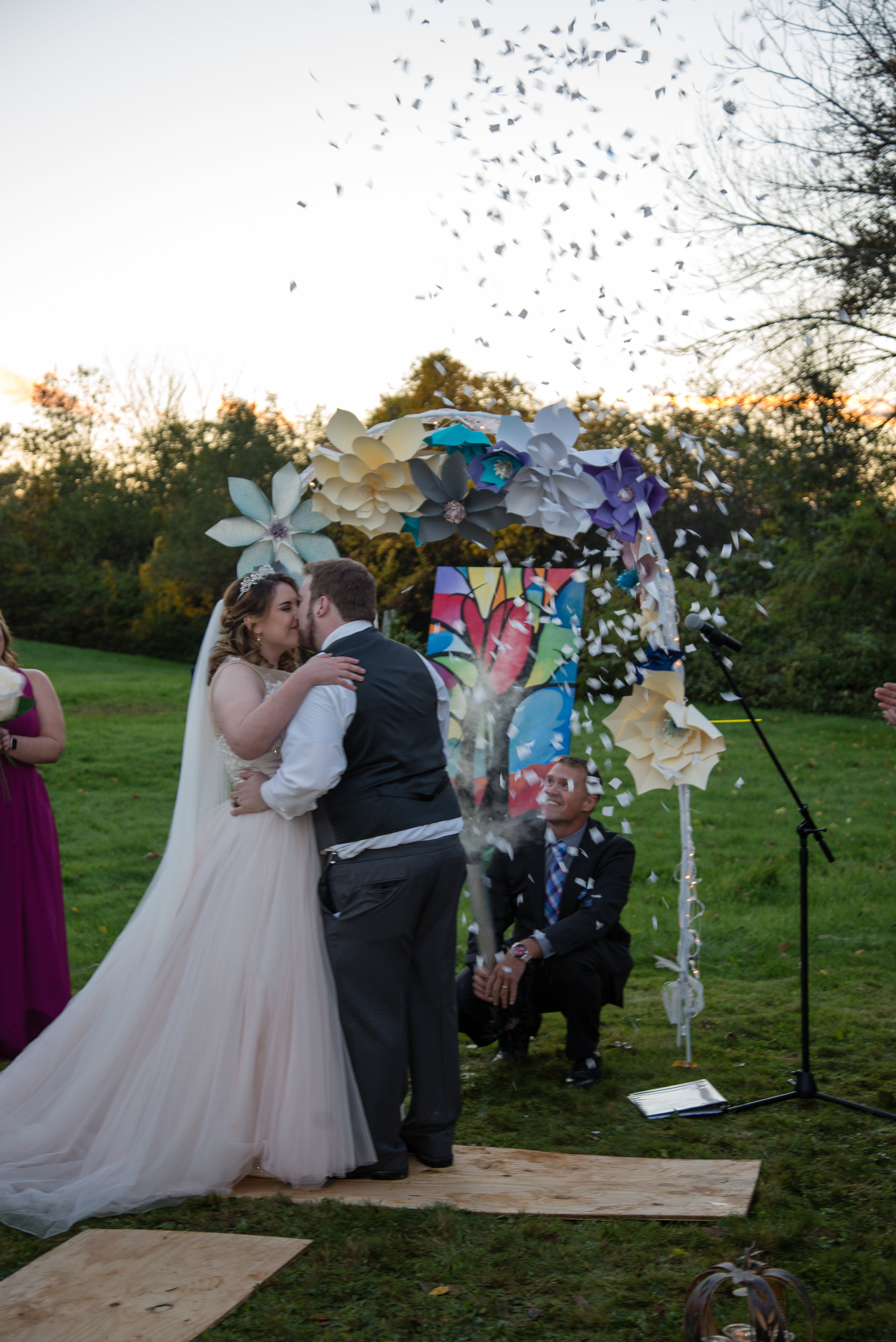 Wow just wow… are you guys ready for the stunning touches and DIYs from this wedding day?! I sure hope so, because I am just OBSESSED with Will and Gabby’s wedding day! These two were married on their friend’s property, by the bride’s brother, and celebrated with family and friends in a beautifully decorated tent afterwards. I am so thankful the rain stopped for their wedding day and the most perfect sunset occurred at the end of their ceremony. This day featured beautiful big paper flowers as bouquets, a gorgeous painting done by the groom’s mom & confetti cannons for the first kiss. Oh and those donuts — DELICIOUS! So glad I got to enjoy one. Talk about an amazing day!!